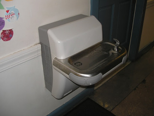 I myself am TERRIFIED of the pre-school water fountain. I do not beleive that pre-schoolers have learned about the whole "don't put your mouth on the fountain" bit. I've seen many a pre-schooler slobber all over the water dispenser. That's too close of a school community for me.